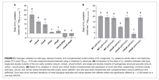 這篇論文研究了好氧土壤細菌通過氧化大氣分子氫(H2)來維持持久存在的機制,重點關注Mycobacterium smegmatis中的兩種[NiFe]-氫化酶Huc和Hhy。摘要指出,大氣H2氧化是生物地球化學氫循環的主要匯,支持貧營養生態系統的生產力。在M. smegmatis中,H2氧化由Huc(group 2a)和Hhy(group 1h)氫化酶催化,但電子傳遞機制尚不明確。研究通過遺傳方法證實,氫化酶操縱子上編碼的推定鐵硫蛋白HucE和HhyE是H2消耗所必需的。序列分析顯示這些蛋白雖同源但屬不同系統發育分支,具有不同金屬結合 motif。缺失這些基因會減少或消除H2氧化,并輕微但顯著降低生長產量和長期生存。生化和表型分析表明,缺失這些蛋白的突變體與氫化酶結構亞基突變體相似。作者假設這些蛋白介導電子從氫化酶到呼吸鏈 menaquinone 池的傳遞,但其他角色(如成熟)也可能。這些蛋白的保守性表明它們是大氣H2氧化的重要決定因素。