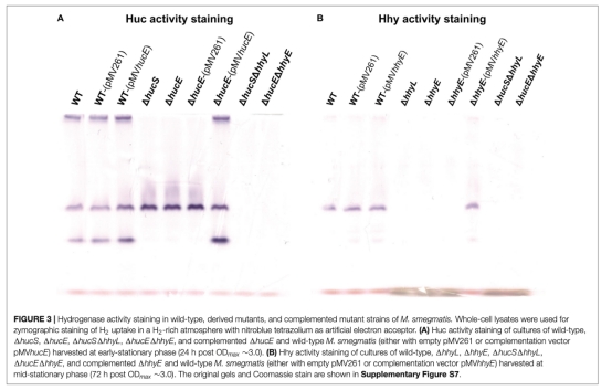 2 氫化酶活性染色數據來自圖3,通過 native PAGE 和 nitroblue tetrazolium 染色檢測。研究意義是可視化氫化酶活性,顯示缺失HucE或HhyE導致活性條帶消失,互補實驗恢復活性,驗證這些蛋白對氫化酶功能不可或缺,且與結構亞基缺失表型一致。