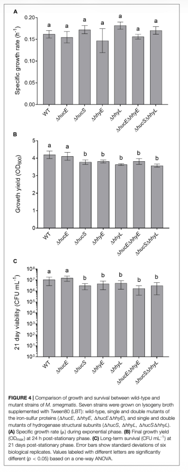 3 生長和生存數據來自圖4,包括生長速率、生長產量和21天生存率。研究意義是評估突變體的生理影響,顯示缺失HhyE或雙突變降低生長產量和生存率,表明氫氣氧化貢獻于能量代謝和長期持久性,但缺失HucE影響較小,提示功能差異。