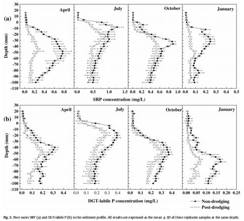 研究意義:這是論文的核心證據。數據顯示,疏浚顯著降低了孔隙水SRP和DGT有效態P的平均濃度和峰值。效果在空間上具有異質性(不同深度效果不同),在時間上具有季節性(冬春季效果更佳)。這直接證明了疏浚對抑制內源磷釋放的有效性,并揭示了其效果的復雜性。