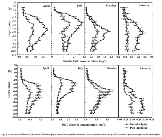 這些鐵氧化物作為“磷陷阱”,有效吸附并固定了孔隙水中的磷酸鹽,從而阻止其向上覆水擴散。這正是研究中觀察到疏浚區孔隙水SRP和DGT有效態P濃度降低的根本原因之一。