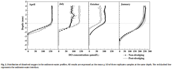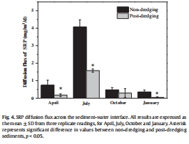 研究意義:量化了內源磷負荷的大小。結果顯示,疏浚后SRP擴散通量在4月、7月和1月顯著降低了76.7%、61.3%和86.6%,但在10月無顯著差異。這為“疏浚成功控制了內源磷負荷”提供了最直接的量化支持,并證實了夏秋季效果較差。
