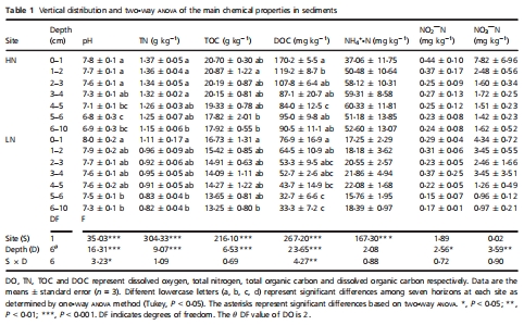 研究意義:定量表征了沉積物不同深度的氧化還原狀態和營養水平。數據顯示DO在約1.5 cm深處降至接近0,確立了氧化/缺氧界面的位置。HN站點的TN、TOC、DOC、NH??-N含量均顯著高于LN站點,成功創建了研究所需的不同營養水平的環境梯度,為解釋anammox細菌的分布差異提供了環境背景。
