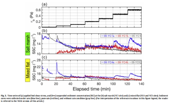 摘要指出,潮間帶頻繁降雨事件在低潮期間會侵蝕和運輸表層沉積物和MPB。本研究通過Gust侵蝕微宇宙系統(GEMS)進行實驗,量化了降雨對鹽沼和混合平坦區沉積物和MPB可蝕性的影響。結果表明: