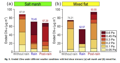 MPB可蝕性:降雨條件下,MPB可蝕性降低,總侵蝕Chl-a減少29%。在混合平坦區,降雨顯著降低了MPB的生物活性(生物量和初級生產),表層Chl-a濃度雨后減少73%。在鹽沼區,MPB生物活性穩定,降雨影響較小,可能由于植被冠層保留了侵蝕的MPB。