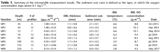 測量數(shù)據(jù):Unisense微電極(Clark型,尖端100 μm)以高空間分辨率(100 μm步長)測量了沉積物-水界面(SWI)附近的溶解氧(DO)垂直剖面,覆蓋擴散邊界層(DBL)和沉積物氧化層。數(shù)據(jù)包括SOU、DBL厚度、氧化層深度和BBL DO濃度,并在多個深度(43-224 m)和時間點(2013-2017)重復(fù)測量。