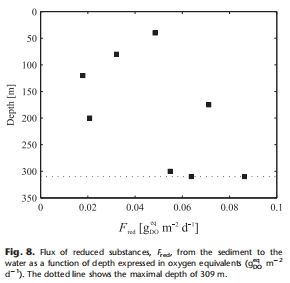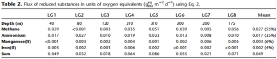 數(shù)據(jù):還原物質(zhì)通量(Fred,包括CH?、NH?、Mn(II)、Fe(II)),轉(zhuǎn)換為氧氣當量(0.018-0.086 gDOeq m?2 d?1)。