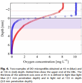 提供高分辨率原位氧氣動力學(xué)數(shù)據(jù):Unisense微電極的毫米級分辨率使能捕捉SWI附近的微觀DO梯度,這是傳統(tǒng)采樣方法無法實現(xiàn)的。數(shù)據(jù)顯示DO濃度在DBL內(nèi)線性下降(圖6),允許通過Fick定律精確計算SOU。這種原位實時測量避免了樣品擾動,提供了更真實的氧氣通量估計,對于理解沉積物-水交換至關(guān)重要。