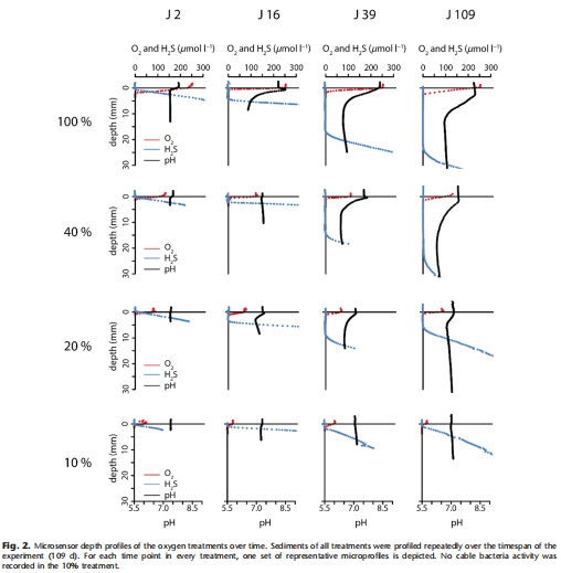 揭示適應(yīng)性行為:通過(guò)對(duì)比不同O2處理的剖面,發(fā)現(xiàn)低氧(20% O2)下OPD更淺,但電纜細(xì)菌部分絲狀體伸出沉積物(圖8)。微傳感器數(shù)據(jù)支持“氧氣獲取策略轉(zhuǎn)型”假說(shuō),即電纜細(xì)菌在氧脅迫下物理延伸以接觸更富氧環(huán)境。