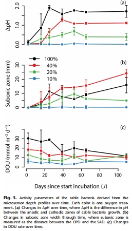 量化氧氣需求:DOU在高氧處理中更高(100% O2時(shí)DOU為16.2 mmol m?2 d?1,表3),證實(shí)氧氣可用性直接控制電纜細(xì)菌的電子接受效率。