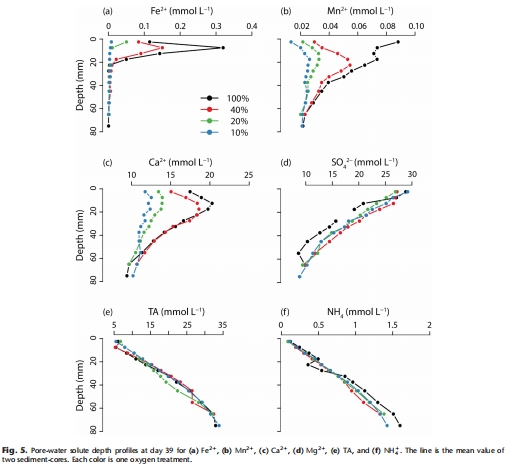 孔隙水地球化學(xué):第39天取樣分析Fe2?、Mn2?、Ca2?、NH??、SO?2?和總堿度(TA)的深度剖面(數(shù)據(jù)來(lái)自圖5)。