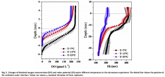 數(shù)據(jù)內(nèi)容:溫度升高導(dǎo)致DO濃度降低(7°C時216 μmol/L → 25°C時107 μmol/L),氧滲透深度從5.6 mm(7°C)減至2.4 mm(25°C);Eh值同步下降,25°C時表層Eh僅為7°C的50%。