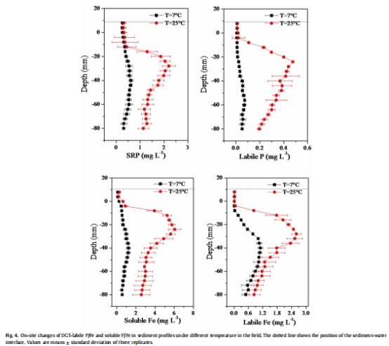 溫度效應(yīng):在微宇宙實驗中,25°C時DGT-labile P和孔隙水SRP平均濃度較7°C分別增加279%和125%;野外條件下增幅更大,分別達460%和189%。