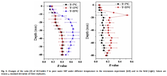 數(shù)據(jù)內(nèi)容:R值(DGT-labile P/ SRP)隨溫度升高而增加,25°C時深層沉積物R值顯著高于7°C,表明固體磷庫再補給能力增強。