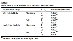 數(shù)據(jù)內(nèi)容:DGT-labile P和SRP濃度隨溫度升高而增加,25°C時均值較7°C分別增245%和103%;Fe呈現(xiàn)類似趨勢,且P/Fe顯著相關(guān)(r > 0.75, p < 0.001)。