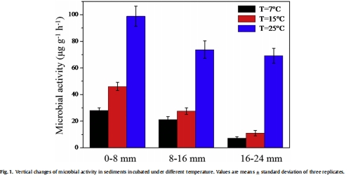 數(shù)據(jù)內(nèi)容:微生物活性隨溫度升高而增加,25°C時0-8 mm層活性較7°C增加252%,16-24 mm層增加866%。