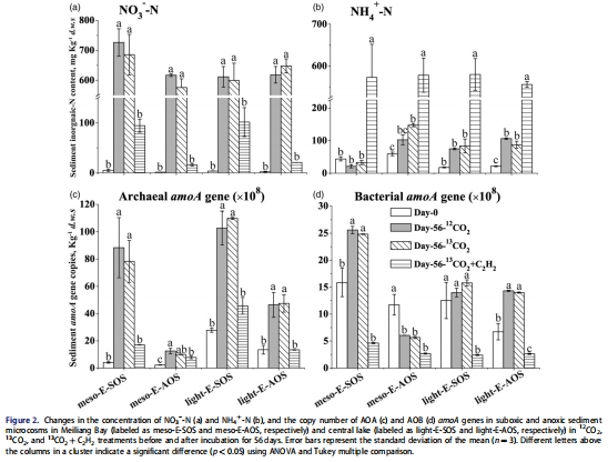數據內容:13C標記的amoA基因在CsCl梯度“重”分數中富集,表明自養活性;AOA在中等富營養化缺氧層標記較少,AOB在輕度富營養化低氧層標記較少。