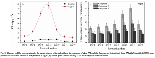 數(shù)據(jù)內(nèi)容:Chla濃度在藻華處理中從第1天27.6 μg L?1增至第15天154.3 μg L?1,之后下降至第70天14.3 μg L?1;CDOM組分(如色氨酸類熒光團)在崩潰期增加。