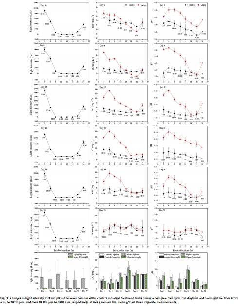 數(shù)據(jù)內(nèi)容:光強、DO和pH呈現(xiàn)晝夜波動,DO白天高(峰值13.3 mg L?1)、夜間低(最低1.5 mg L?1),pH白天高(峰值10.53)、夜間低。