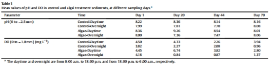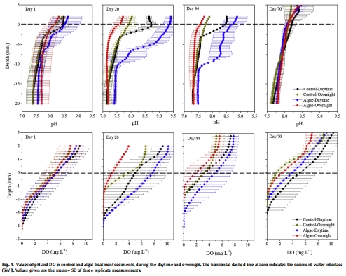 數(shù)據(jù)內(nèi)容:藻華處理中,表層沉積物(0至-2.5 mm)pH白天高(9.26)、夜間低(7.36),DO白天高(6.74 mg L?1)、夜間低(0.84 mg L?1);受影響深度達-20 mm(pH)和-3.5 mm(DO)。