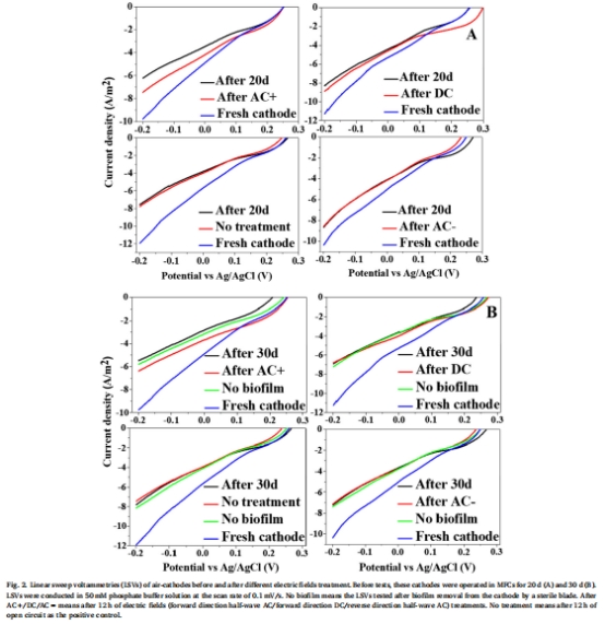AC+電場高效再生陰極:AC+處理顯著恢復電流密度(43-50%)和功率密度(37%),優于DC處理,且能耗低至1/4,適用于實際MFCs。