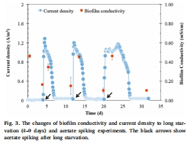 生物膜電導率與代謝活動相關:長期饑餓導致電導率下降,但添加底物后可恢復,表明電導率動態(tài)受產(chǎn)電菌catabolism調(diào)控。