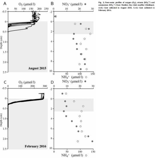 數據:使用Unisense微電極測量的溶解氧(O?)垂直剖面,以及硝酸鹽(NO??)和銨鹽(NH??)的濃度深度分布。