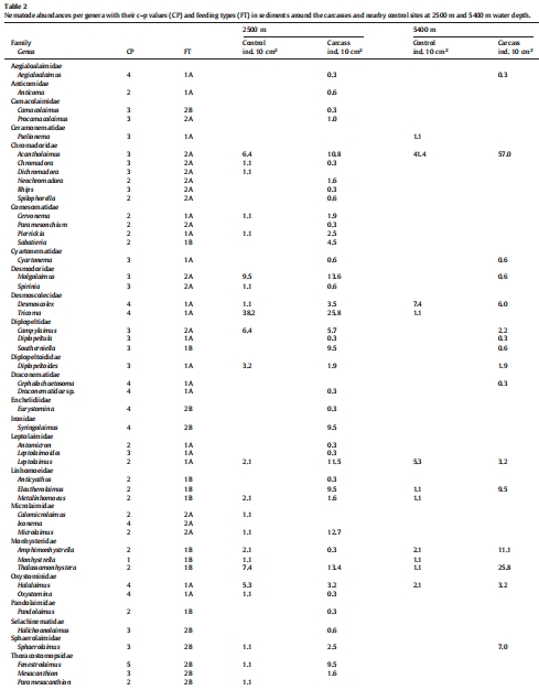 水深是關鍵影響因素:食物沉降的降解速度和其對線蟲群落的影響強度因水深而異。在2500米處,清道夫(如大型端足類)更活躍,尸體降解更快,對線蟲群落的影響(如多樣性增加、功能群轉變)更為明顯。而在5400米處,降解較慢,影響相對較弱。