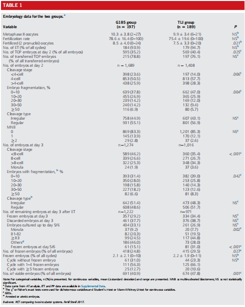 研究意義:這些是直接反映培養環境對胚胎早期發育質量影響的核心指標。結果顯示,TLI組的胚胎在第2天發育更快(<4細胞的胚胎更少)、碎片更少(0-10%碎片的胚胎更多),并且優質胚胎比例顯著更高(TLI組40.4% vs. G185組35.2%)。這表明更穩定的封閉培養環境(減少溫度、氣體和PH值的波動)有利于胚胎的早期發育質量。