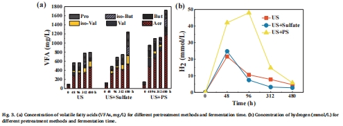數(shù)據(jù):US+PS預(yù)處理下,VFA生產(chǎn)最高(1708.3 mg/L),乙酸占比74.8%;氫氣產(chǎn)量顯著增加。