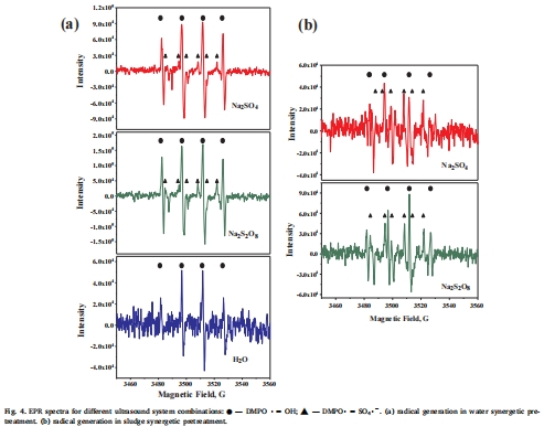 數(shù)據(jù):EPR顯示US+PS系統(tǒng)產(chǎn)生更多·OH和SO?·?自由基(強(qiáng)度1.7×10? a.u.和4.5×10? a.u.)。