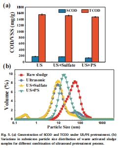 數(shù)據(jù):高US密度(12 W/mL)下,US+PS預(yù)處理導(dǎo)致小顆粒(0.1-0.5μm)消失,SCOD和TCOD減少(COD損失25.7%)。