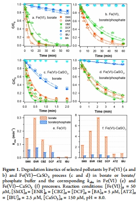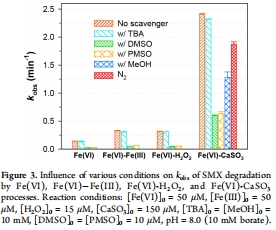 數(shù)據(jù):在pH 8.0下,F(xiàn)e(VI)-CaSO?過(guò)程對(duì)SMX的降解速率常數(shù)(kobs)比Fe(VI)單獨(dú)高16.5-173.7倍(硼酸鹽緩沖)或6.1-12.6倍(硼酸鹽/磷酸鹽緩沖);苯甲酸(BA)幾乎不降解。