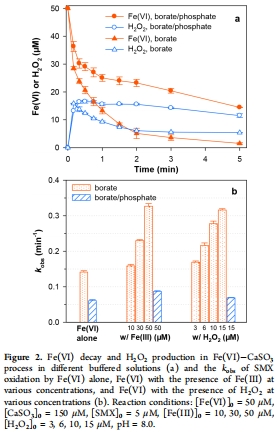 數(shù)據(jù):Fe(VI)-CaSO?過(guò)程中,F(xiàn)e(VI)在硼酸鹽緩沖下衰變更快,H?O?快速積累后下降;磷酸鹽緩沖下H?O?穩(wěn)定。