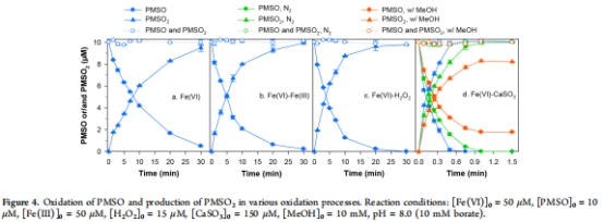 數(shù)據(jù):Fe(VI)-CaSO?過(guò)程中,PMSO完全轉(zhuǎn)化為PMSO?(磺酰產(chǎn)物),而Fe(VI)單獨(dú)氧化率<5%;MeOH抑制該轉(zhuǎn)化。
