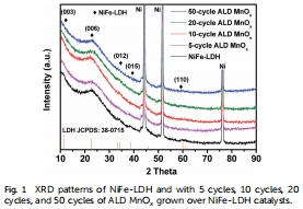 數(shù)據(jù):顯示NiFe-LDH的特征衍射峰(如(003)、(006)晶面),ALD后無(wú)新峰,但峰強(qiáng)度輕微降低。