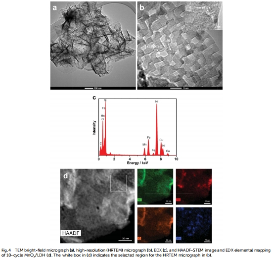 數(shù)據(jù):SEM(Fig. 3a-b)顯示MnO?納米島均勻覆蓋LDH表面;TEM(Fig. 4a-b)顯示非晶MnO?島和LDH晶格條紋(0.25 nm,對(duì)應(yīng)(012)晶面);EDX mapping(Fig. 4c-d)顯示Mn元素均勻分布,原子百分比約8%。