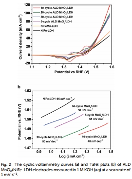 催化劑合成:先通過(guò)水熱法在Ni泡沫上生長(zhǎng)NiFe-LDH納米片,然后使用ALD(以Mn(EtCp)?和H?O為前體)沉積不同循環(huán)數(shù)(5、10、20、50循環(huán))的MnO?納米島。