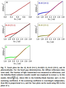 數(shù)據(jù):UV-Vis光譜顯示Bi:Al材料吸收邊延伸至800 nm;Tauc圖計(jì)算帶隙:Bi:Al(21:1)為1.83 eV,Bi2O3為2.02 eV。