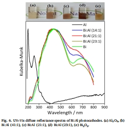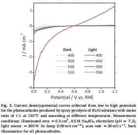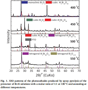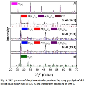 材料合成:通過(guò)噴霧熱解在FTO基底上沉積Bi:Al前體溶液(Bi:Al摩爾比1:1至3:1),在130°C沉積后于400-550°C退火,形成結(jié)晶薄膜。