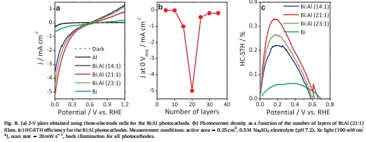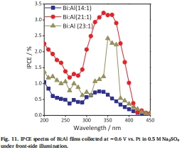 數(shù)據(jù):IPCE譜在340 nm處峰值3.2%(Bi:Al(21:1));半電池太陽(yáng)能-氫(HC-STH)效率0.33% at 0.16 V vs. RHE。