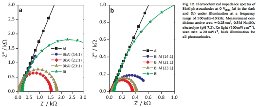 數(shù)據(jù):EIS Nyquist圖顯示Bi:Al(21:1)電荷轉(zhuǎn)移阻力最小(光照下0.3 kΩ),低于Bi2O3(2.5 kΩ)。