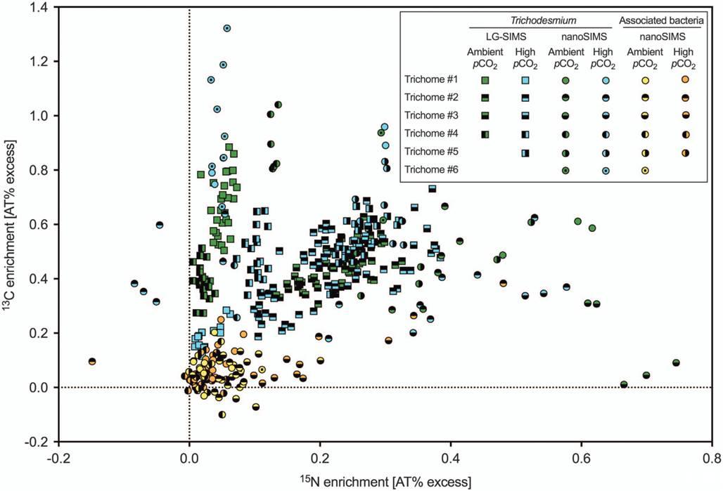 圖3、使用LG-SIMS(正方形點,二次離子質譜分析儀)和Nano-SIMS(圓形,納米離子探針型離子質譜分析儀)對束毛藻單體以及其伴生細菌體內的13C和15N跟蹤標記圖。不同顏色的點代表的是所取的不同束毛藻單體以及在不同的二氧化碳分壓環境下的使用SIMS分析的C以及N的豐度含量分析。
