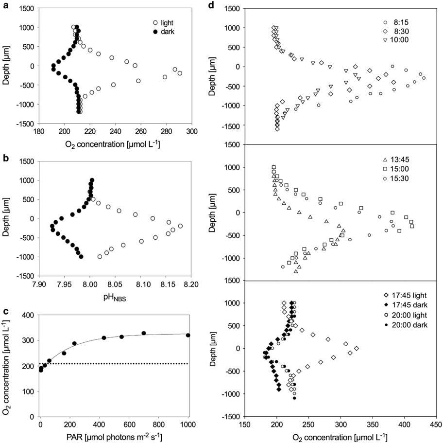 應用了unisense氧微電極和pH微電極,所使用的氧微電極尖端直徑都為10微米、PH電極的尖端直徑都為100微米,所使用的電極都經過了兩點矯正法獲取了相應的標準曲線,其中的氧氣濃度以及pH是在定制通入的流動海水的系統中,結合解剖顯微鏡測試束毛藻周圍環境剖面的氧氣濃度以及pH值,流動系統中海水中一直鼓有二氧化碳氣體來獲得不同的二氧化碳分壓。