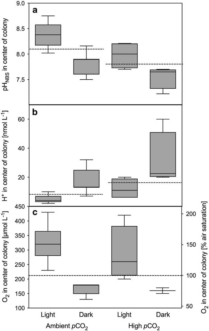 圖2、在不同二氧化碳分壓環境的水體環境中束毛藻克隆體周圍在光照環境和無光照環境下的溶氧濃度和pH值的變化情況。其中圖a表示的是pH值和質子氫的濃度分布情況。圖b表示的是氧濃度的分布情況。圖c表示的是是束毛藻克隆體中心區域的氧濃度分布情況。從圖中可以看出,在常規環境的二氧化碳分壓下,束毛藻在光照條件下克隆體周圍的pH濃度大約為8-8.5,而在無光照條件下,其pH下降至7.5-8.0之間。二氧化碳分壓濃度值較高時,束毛藻環境周圍的pH在光照條件下的pH值較大,大約為7.6-8.3之間,而在無光照環境條件下,其pH降至7.2-7.6之間。