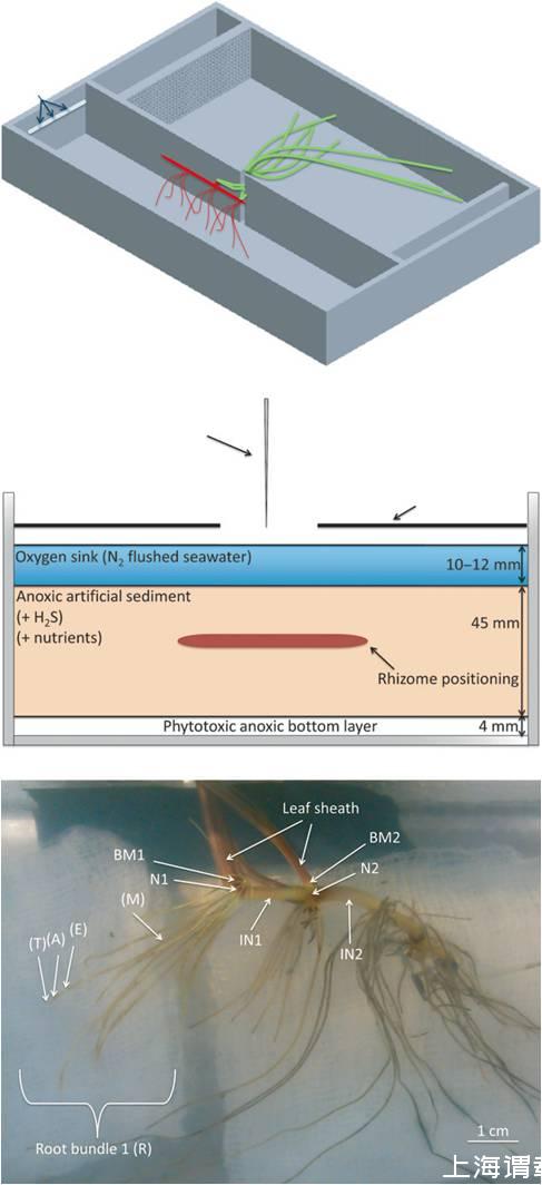 圖1、圖a表示的是模擬的分流實(shí)驗(yàn)箱設(shè)備圖,試驗(yàn)箱的另一端有流動(dòng)的水相以及缺氧的沉積物層。圖b表示的是應(yīng)用微電極測試人造模擬的具有三層結(jié)構(gòu)的沉積物底泥系統(tǒng)。圖b中可以看出模擬底泥系統(tǒng)中的最上層是一層含有10-12毫米厚的流動(dòng)水相,中間層是含有一定濃度硫化氫的無氧沉積物底泥最下層是植物性毒物底層(厚度為4mm),圖c表示的是大葉藻在地下的根際組織區(qū)域的空間分布示意圖。其中T代表的是根尖/根冠,A代表的是頂端分生組織區(qū)域,E代表的是根的伸長區(qū)域,M代表的是根的生長成熟區(qū)域,BM代表的是帶葉鞘的基底分生組織,N表示的是根的節(jié)點(diǎn),IN表示的是植物的節(jié)間區(qū)域。
