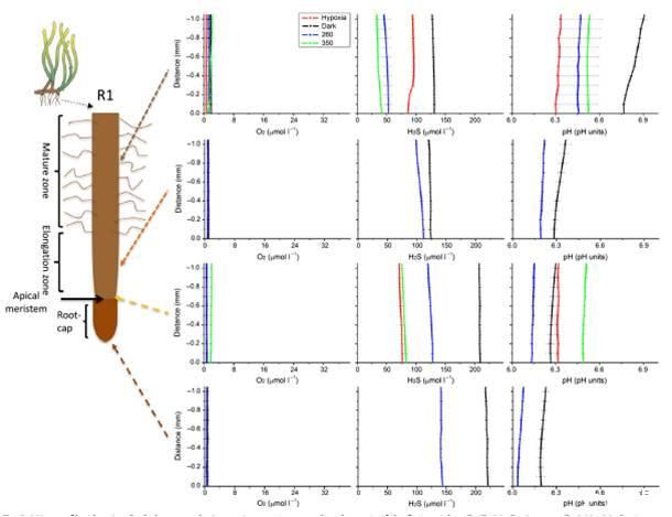 應(yīng)用了unisense氧微電極和pH微電極和硫化氫電極,所使用的氧微電極尖端直徑都為100微米,硫化氫電極尖端直徑為50微米,pH電極的尖端直徑為50微米,通過使用自動(dòng)馬達(dá)設(shè)備與微電極聯(lián)用測試了大葉藻根際區(qū)域的不同深度位置區(qū)域的氧氣的濃度,pH、以及硫化氫的濃度分布情況。