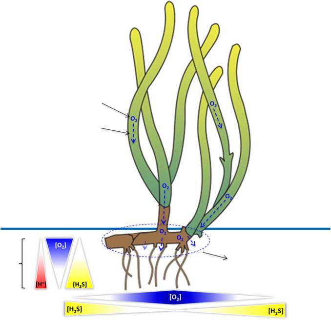 本論文研究了大葉藻根際周圍區(qū)域的環(huán)境變化對(duì)于大葉藻根系的生長影響,研究發(fā)現(xiàn),大葉藻能夠利用其中的根際的葉鞘區(qū)域產(chǎn)生的高速率的產(chǎn)氧量來改變其自身生長的微化學(xué)環(huán)境,這也確保了能夠產(chǎn)生植物性毒素的硫化氫能夠被氧化,形成化學(xué)防御機(jī)制,保護(hù)大葉藻脆弱的根部分身組織,另外植物自身的pH調(diào)節(jié)導(dǎo)致的pH值變大的過程通過將硫化物以及降低植物性毒素H2S轉(zhuǎn)換為無植物毒性的HS-離子。