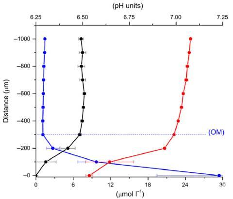 圖4、大葉藻葉鞘的基底分生組織的含氧微屏蔽區(qū)(OM)的微剖面分析圖。其中藍(lán)色線表示的是氧氣濃度剖面分析圖,黑色的線代表的是硫化氫的濃度剖面分析圖,紅色的線代表的是pH濃度分布圖。從圖中可以看出,氧氣濃度的分布從0-30umol/L,而pH值的分布范圍為6.5~7.2,硫化氫濃度分布0~6.5umol/L。越靠近大葉藻的土壤表層,氧氣的濃度越大,而硫化氫則表現(xiàn)相反,表層的硫化氫濃度較低。