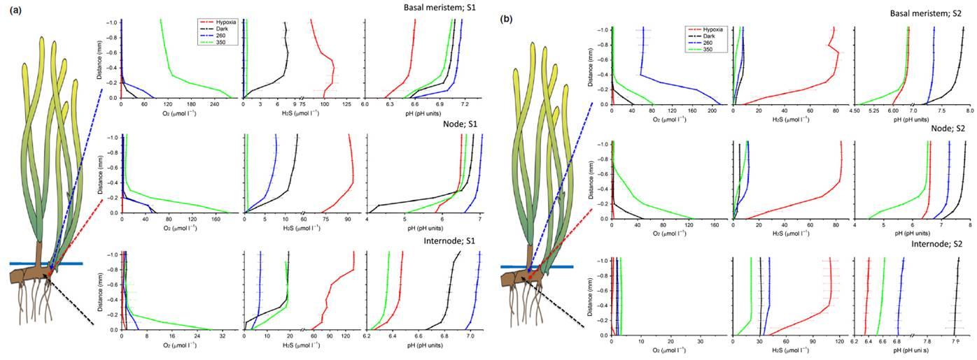 圖2、應(yīng)用Unisense微電極測試的大葉藻根際區(qū)域不同組織區(qū)域(葉鞘的基底分生組織區(qū)域、根的結(jié)點(diǎn)區(qū)域、根的間區(qū)域)的氧氣濃度、pH、硫化氫的剖面圖。其中t圖a和圖b分布表示的是所取的兩組不同根際區(qū)域。其中圖a,b中的四種不同顏色的線分布表示的是紅色線(低氧狀態(tài)下)、黑色線(無光照條件)、藍(lán)色線(使用了波長為260nm的紫外光線光照)、綠色線(波長為350n的紫外光線光照)。從圖中可以看出,在低氧狀態(tài)下的根據(jù)組織區(qū)域的各位區(qū)域中的氧氣濃度都很低,而在無光照條件、使用波長為260n、350nm的紫外線的條件下,根際組織區(qū)域部分的氧氣濃度越靠近根際的表層,其氧氣濃度越大,而對(duì)于硫化氫來說,根據(jù)的表層的硫化氫濃度較低,根際底部區(qū)域的硫化氫濃度較大。而pH則是靠近根際表層區(qū)域的pHj較小,遠(yuǎn)離根際的底部的pH值較大。